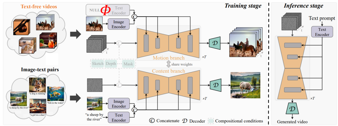 训练时,两个分支联合训练,motion分支可以专注于3D-UNet中运动模块的学习,而content分支则可以学习表观信息,提升视频生成质量。