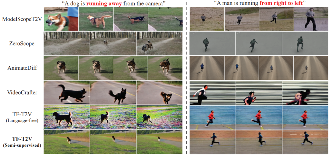 实验结果2:在半监督设定下,与其他一些开源方法的对比,TF-T2V可以保持对文本的精准控制,如“人从右往左跑”,生成的视频可以参考项目主页。