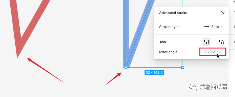 下图中,蓝色路径的转角突破了阈值,小于 28.96,于是从 miter 变成了bevel。