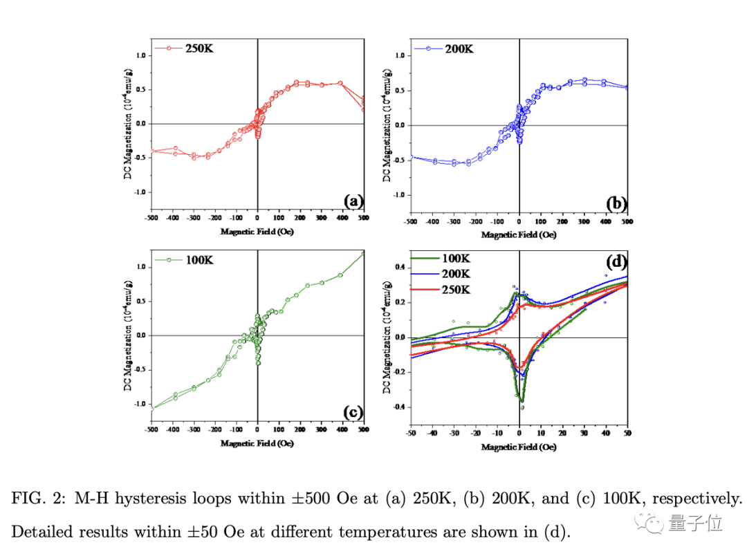3、在250K以下,检测到了典型的超导磁滞回线(也就是下图d中的钻石曲线,标准超导材料的标志之一,不太对称是因为玻璃态记忆效应),以及磁场正向和反向扫描之间存在不对称性。