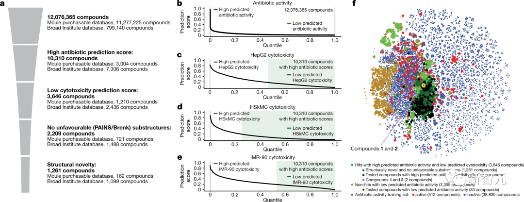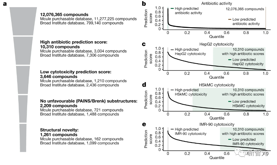 使用这些集成来预测12076365种化合物的抗生素活性,和细胞毒性特征,其中包括来自Mcule数据库的11277225种化合物,还有来自Broad Institute数据库的799140种化合物(如下图所示)。