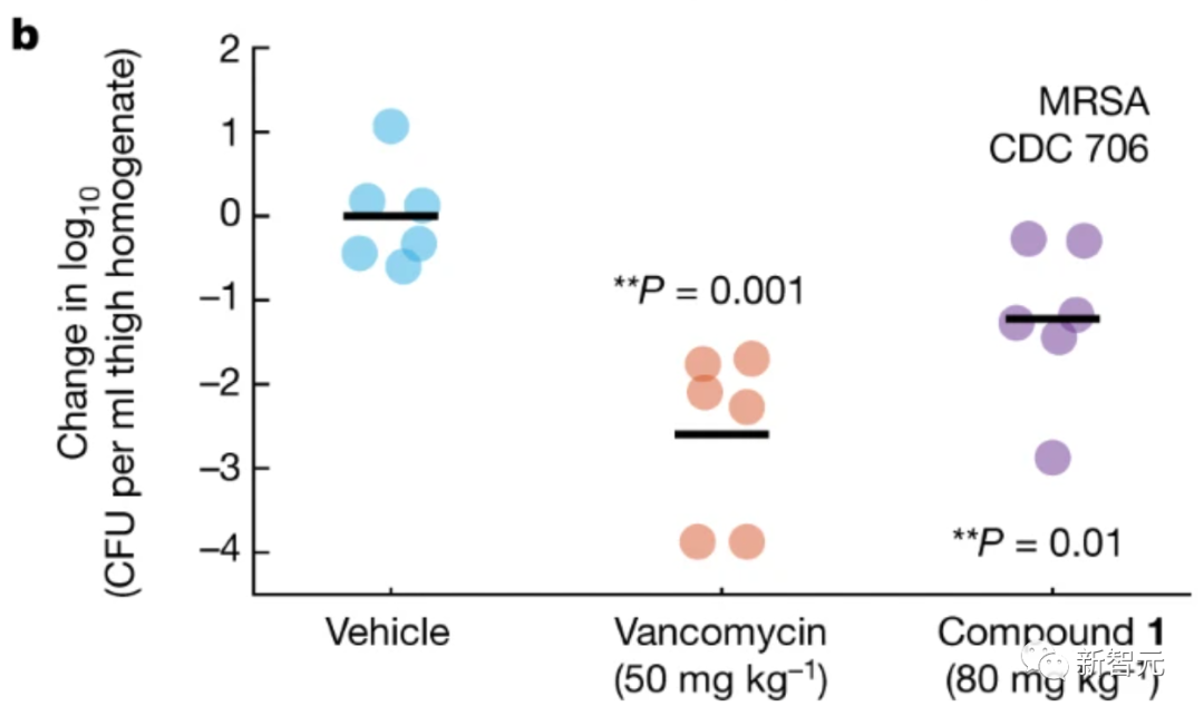 果然,在涉及两种小鼠模型(一种是MRSA皮肤感染模型,另一种是MRSA全身感染模型)的实验中,每种化合物都能将MRSA的数量减少10倍以上。