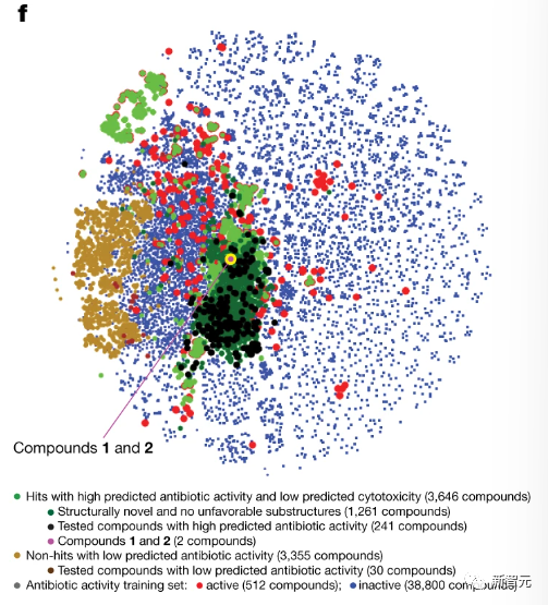 上图是抗生素预测得分高和低的化合物(t-SNE图),显示了各种化合物的化学相似性或不相似性。