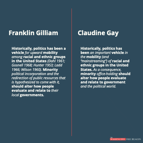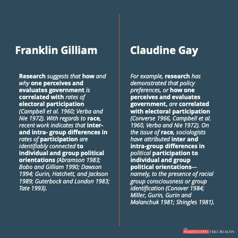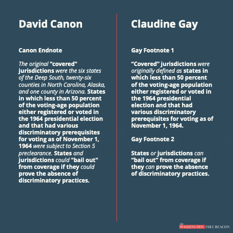 在2001年的一篇文章中,Gay几乎一字不差地复制了威斯康星大学政治学教授David Canon近半页的内容。
