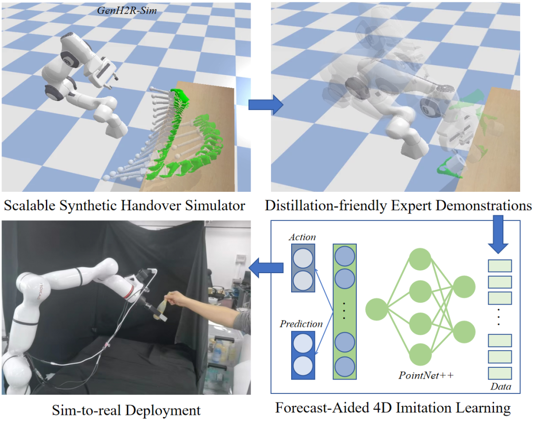 因此,「GenH2R」框架被提出,分别从仿真(Simulation),示例(Demonstration),模仿(Imitation)三个角度出发,让机器人第一次基于端到端的方式学习对任意抓取方式、任意交接轨迹、任意物体几何的通用交接:1)在「GenH2R-Sim」环境中提供了百万级别的易于生成的各种复杂仿真交接场景,2)引入一套自动化的基于视觉 - 动作协同的专家示例(Expert Demonstrations)生成流程,3)使用基于 4D 信息和预测辅助(点云 + 时间)的模仿学习(Imitation Learning)方法。