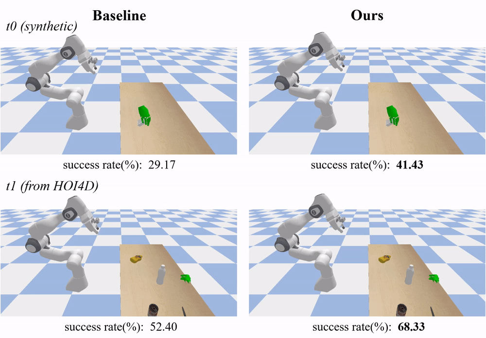 在真实数据测试集 t1(GenH2R-sim 从 HOI4D 引入,比之前工作的 s0 测试集增大约 7 倍)中,GenH2R 的方法可以泛化到没有见过的、具有不同几何形状的真实世界物体。