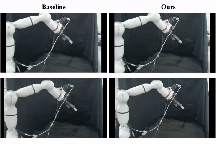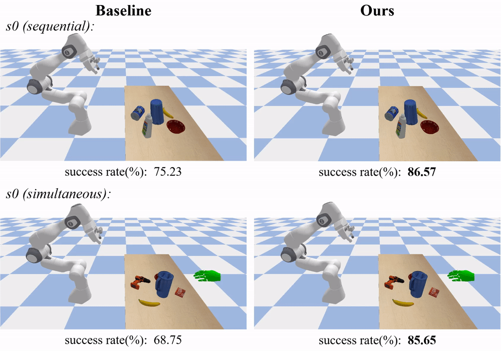在真实数据测试集 s0 中,GenH2R 的方法可以成功交接更复杂的物体,并且能够提前调整姿势,避免在夹爪靠近物体时再频繁进行姿势调整: