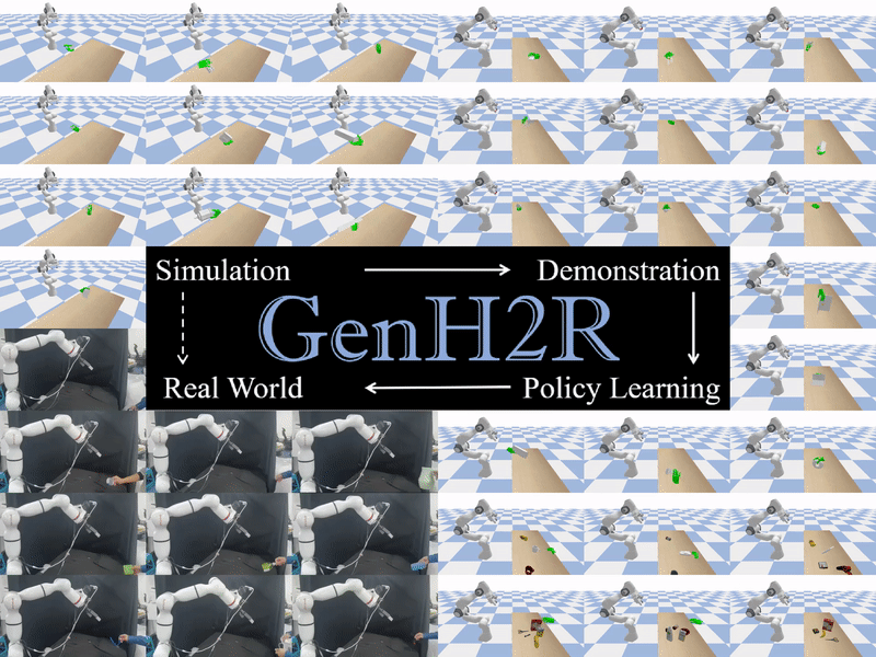 GenH2R 同时将学到的策略部署到现实世界中的机械臂上,完成 “sim-to-real“的跳跃。