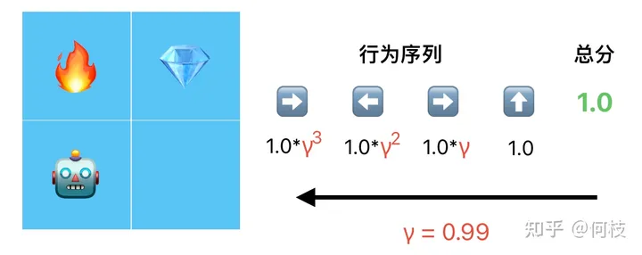 我们认为,越靠近最末端的行为对得分的影响越大,于是从后往前,每往前行为就乘以 1 次折扣因子 γ: