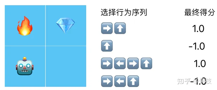 不同的行为选择序列得到的得分:假设拿到 得1分,碰到 得-1分,其余情况不加分也不扣分