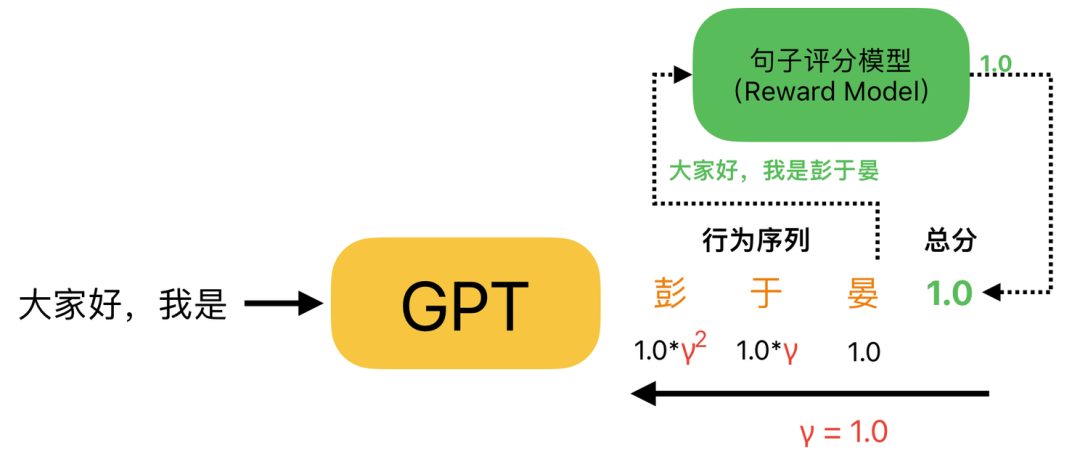 值得注意的是:通常在对 GPT 生成句子进行得分拆解的时候,折扣因子(γ)会取 1.0,