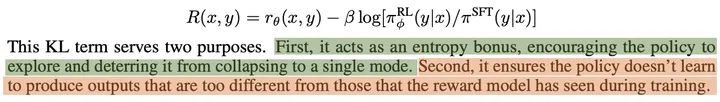 通过概率差异(KL)作为 reward 有 2 个好处:1. 避免模型崩溃到重复输出相同的一个字(模式崩溃)。2. 限制 RL 不要探索的离一开始的模型(SFT)太远