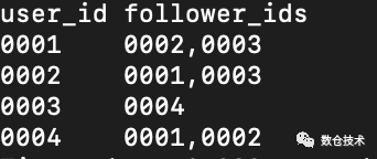 现有用户关注者列表记录表t_user_follower,有两个字段,用户ID(user_id),关注者列表(follower_ids),关注者列表中是关注用户的用户ID,数据样例如下: