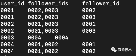 from t_user_follower lateral view explode(split(follower_ids,',')) t as follower_id执行结果