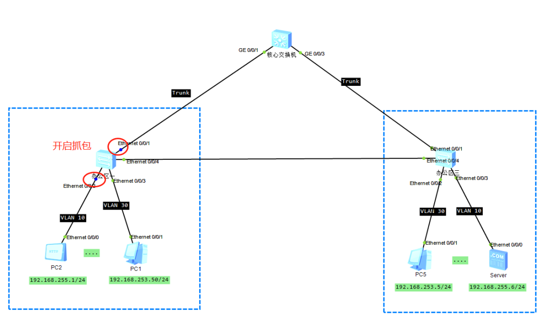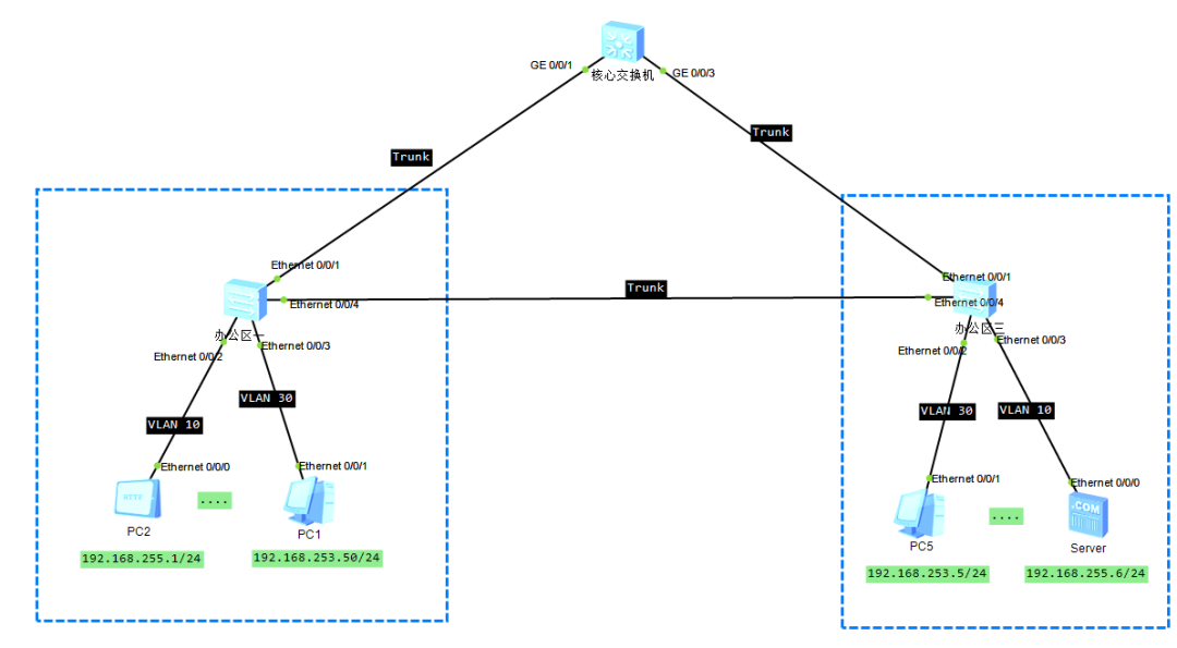 把环境简化下,办公区二暂时不看,中间接了一根线路(注意,配置还是引用的之前VLAN间互通的,注意,server记得开启服务)