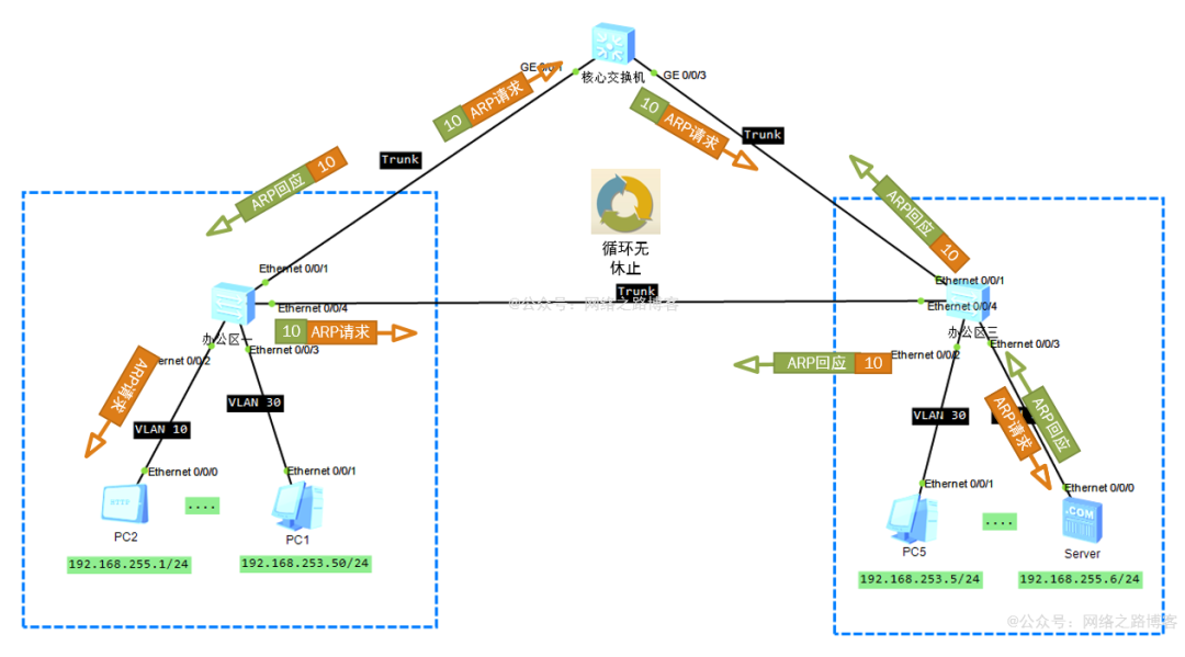 会发现PC2的ARP包一直在网络中重复的发送,服务器也会回应了ARP,但是最终没有到达过PC2,而是永无休止的在网络中发送着,一直在打环一样,这就是环路。
