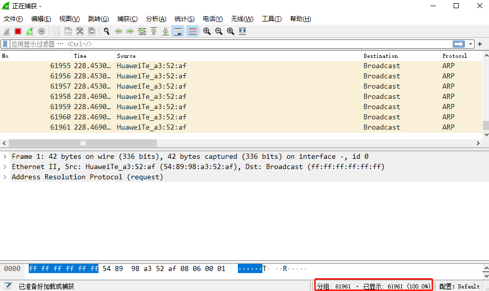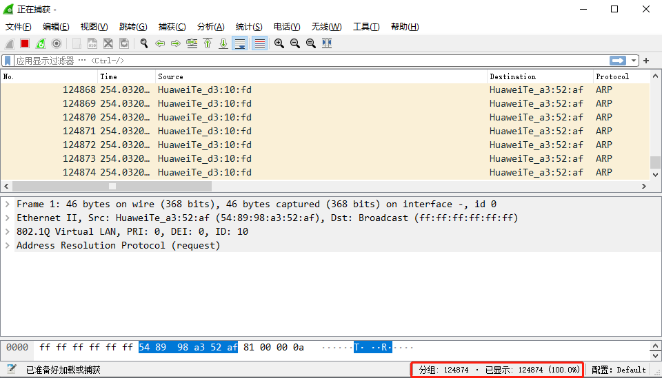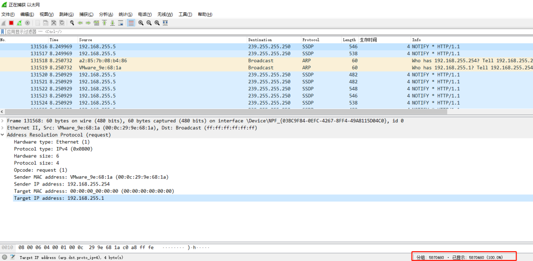 拔掉以后,立马恢复。抓包还可以发现,不到几分钟就有500多万的包产生了,如果终端一多,这个数据包数量更加惊人!!