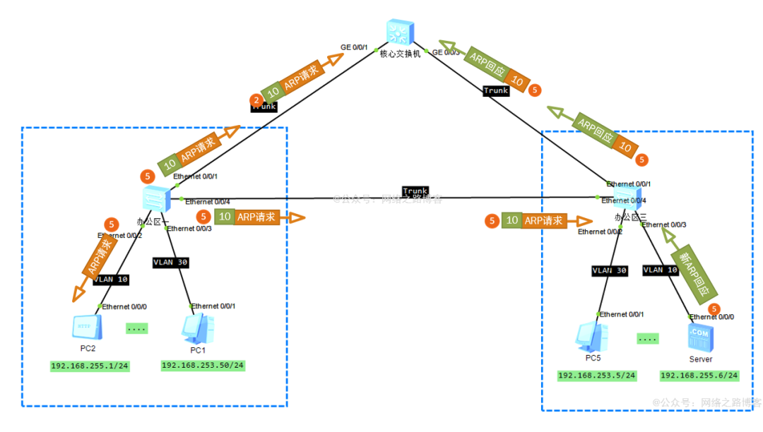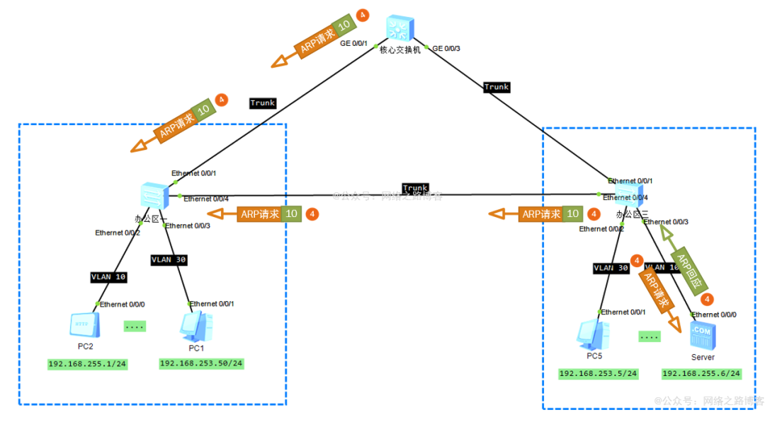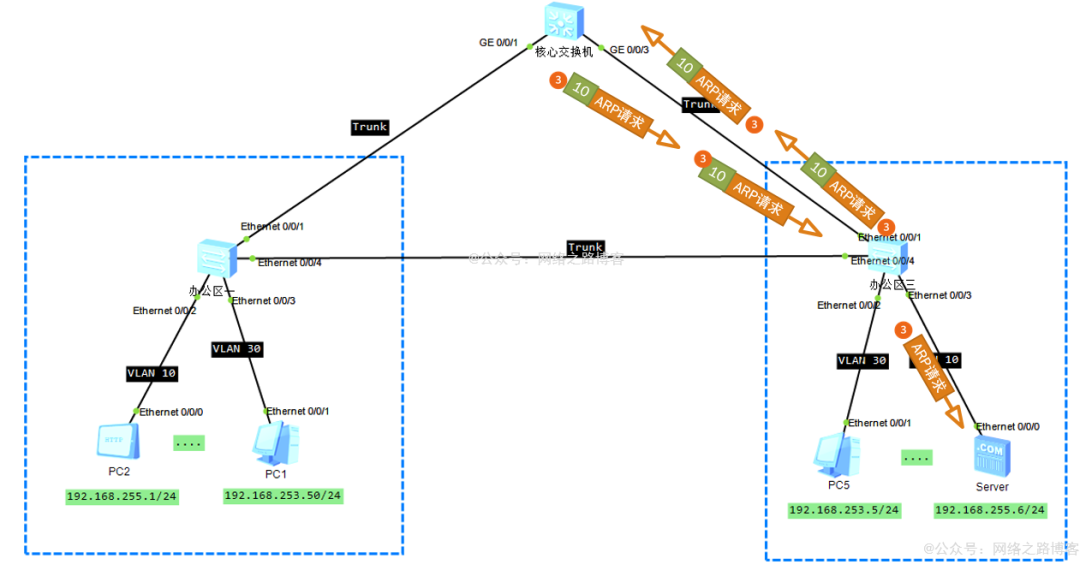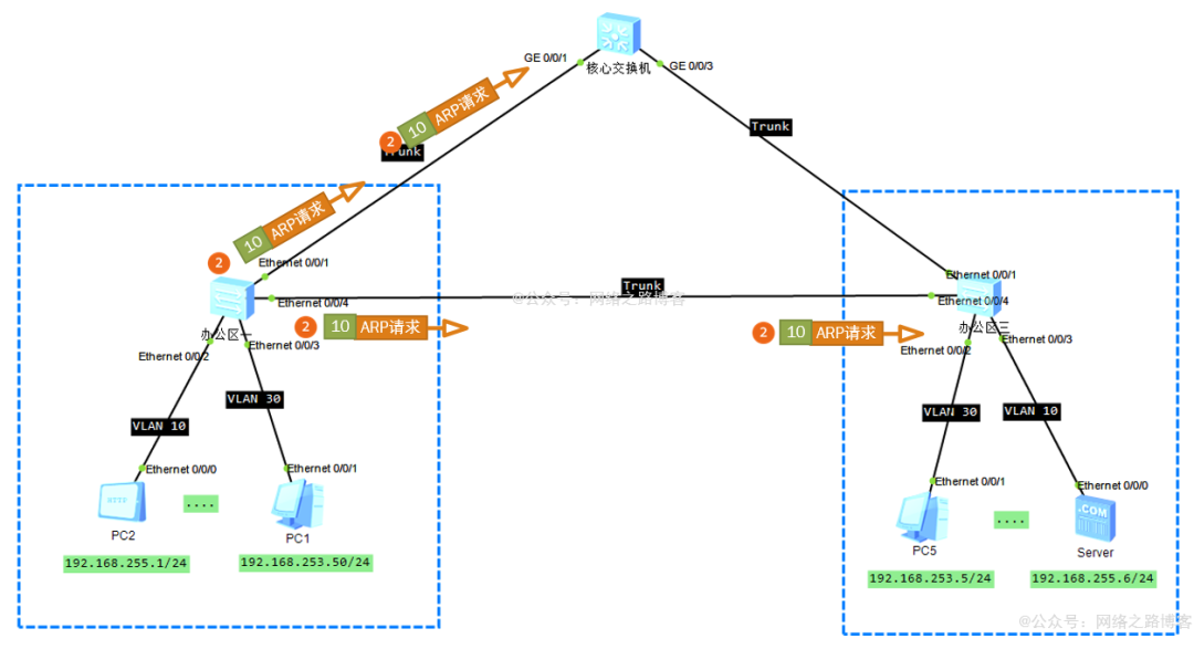 (3)此时核心交换机与办公区三交换机都会收到这个ARP请求,它们会跟办公区一的转发机制一样,记录学习源MAC地址、接口、VLAN信息,发现目的MAC是全F,于是开始对该VLAN内除源接口以外的所有接口开始泛洪,核心交换机会从G0/0/3发送出去,办公区三会从E0/0/3与E0/0/1发出,其中Trunk链路保持VLAN透传,去往服务器的口access剥离标签。