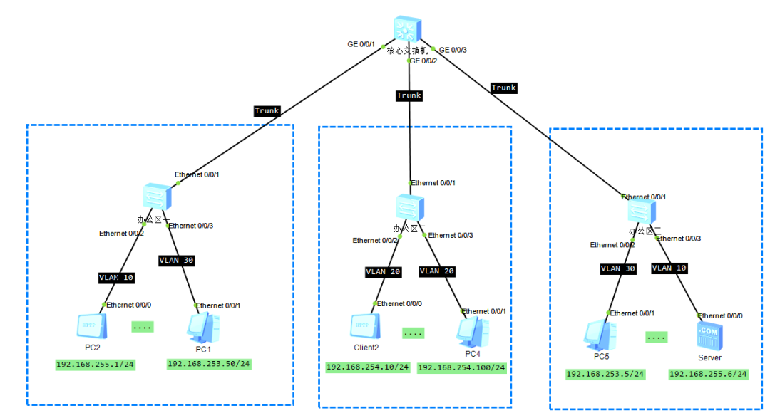 办公区三 | PC2,server | 10 | E0/0/4 | E0/0/1 |