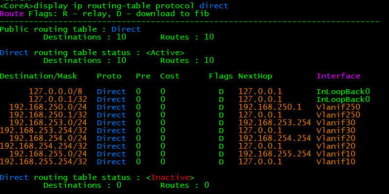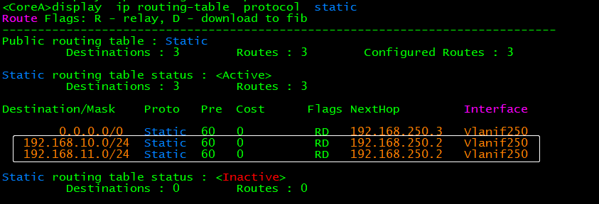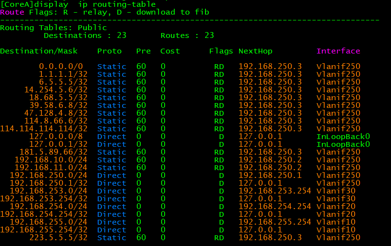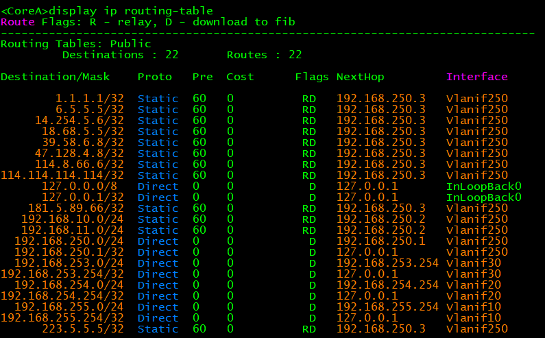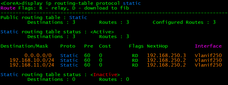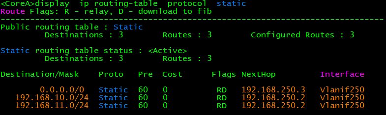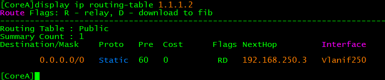 [CoreA]ip route-static 0.0.0.0 0.0.0.0 192.168.250.3