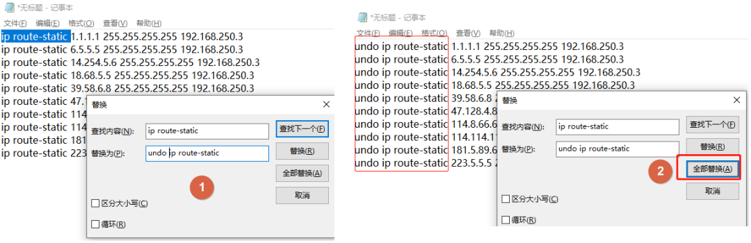 一条一条的undo掉,但是这样就太费时间了,这里博主教大家一个方法,可以把这些静态路由复制出来在记事本,然后把需要的删除掉条目,剩下的都是不需要了的,可以用替换法,在前面加一个undo,这样几个小操作就完成了。
