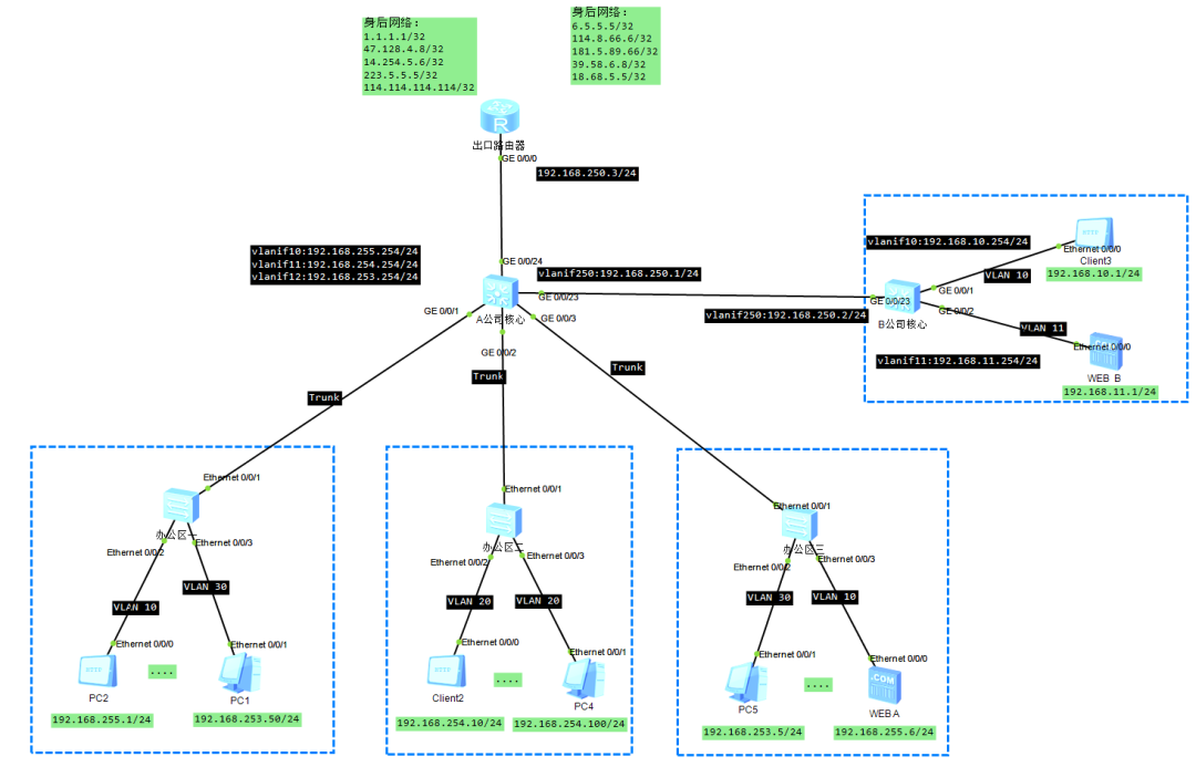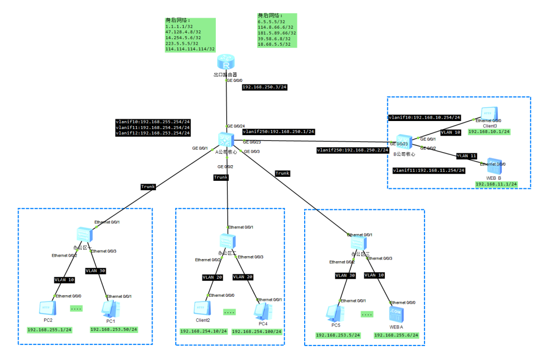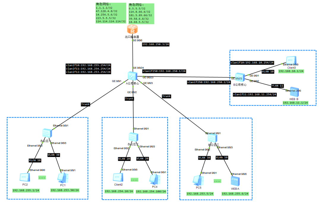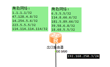 该环境中,使用的是loopback口模拟的身后网络,接口上面配置地址,设备就会产生直连路由,出口路由器这里是没有写默认路由的,但是需要返回流量,所以有三条静态路由,分别去往192.168.253.0/24、192.168.254.0/24、192.168.255.0/24走192.168.250.1(核心对接)(实际中出口路由器是一定要有默认路由去往运营商的网络的,否则会导致上网流量无法发出)