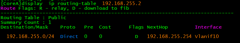 匹配到192.168.255.0/24,这个是直连路由,掩码24位(范围1~254)包含192.168.255.2,该设备就知道要从vlanif250的物理接口发出,如果访问的目的是1.1.1.1