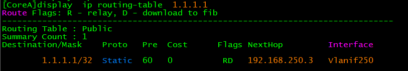 ip route-static 1.1.1.1 255.255.255.255 192.168.250.3