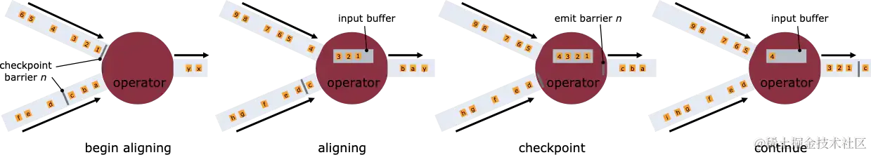当两条边下发barrier时,barrier1比barrier2先到达了算子,那么算子会将一条边输入的元素缓存起来,直到barrier2到了做Checkpoint以后才会下发元素。