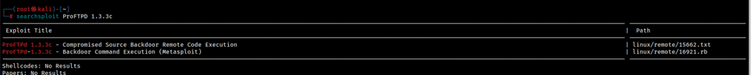 从上面的扫描结果可以看到目标服务器开启了21、22、80端口,而且注意到目标服务器中的FTP服务版本为ProFTPD 1.3.3c,所以我们可以直接利用该服务对应的漏洞对目标服务器实施攻击操作,首先我们使用searchsploit进行漏洞的检索操作