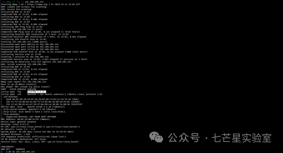 这里以"basic_pentesting_1"靶机中的ProFTPD 1.3.3c版本为例进行漏洞的检测与利用,首先执行以下命令来获取目标主机的IP地址信息