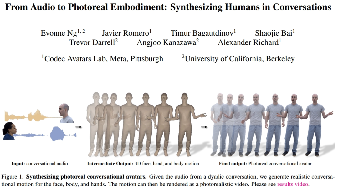 为此,Meta 与加利福尼亚大学的研究者提出了一种根据两人对话的语音音频生成逼真虚拟人的方法。它可以合成各种高频手势和表情丰富的面部动作,这些动作与语音非常同步。对于身体和手部,他们利用了基于自回归 VQ 的方法和扩散模型的优势。对于面部,他们使用以音频为条件的扩散模型。然后将预测的面部、身体和手部运动渲染为逼真虚拟人。研究者证明了在扩散模型上添加引导姿势条件能够生成比以前的作品更多样化和合理的对话手势。
