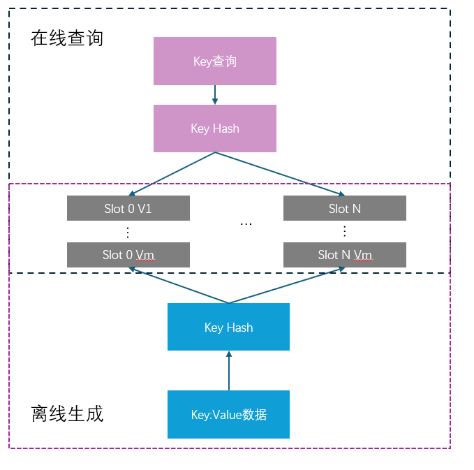 具体来说,对于KV场景,将每个版本的数据,根据特定的hash规则将数据分成多片,每片离线按照Bitcask的思路,生成好hint文件和数据文件,上接一个分布式服务提供查询即可。对于增量的数据,只需要按同样的hash规则,先生成好数据,将数据文件加载即可,这样可以确保数据的一致。同一组的slot文件,如果一台机器加载不下,可以多台机器加载,分布式服务做好控制即可。查询时,像对key做hash,然后并发去查询对应slot的服务即可。