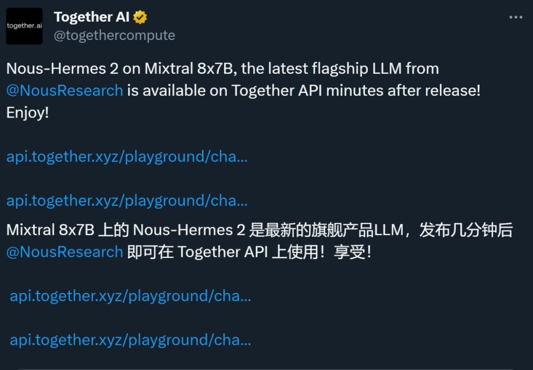 在模型发布之后不久,生成式 AI 初创公司 Together AI 就宣布了其 API 对该模型的支持。Together AI 去年 11 月刚完成超一亿美元的 A 论融资。在 Nous Research 训练和微调 Nous Hermes 2 Mixtral 8x7B 模型期间,Together AI 为他们提供了算力支持。