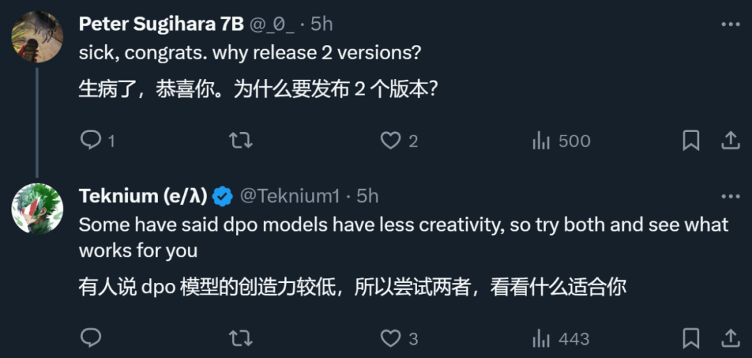 至于为什么发布两个版本,@Teknium (e/λ) 给出了以下解释:
