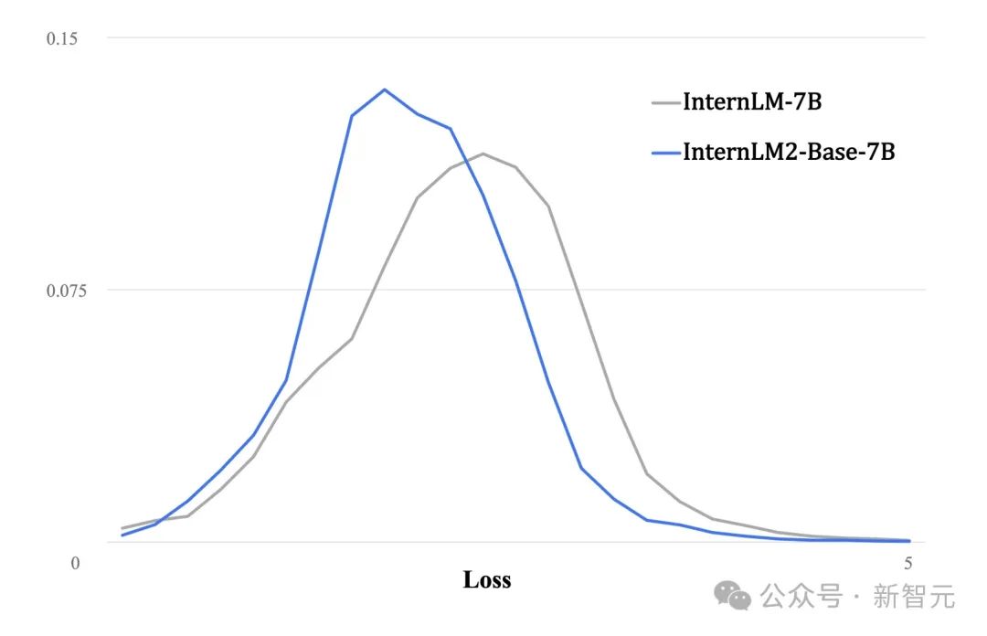 与第一代InternLM相比,InternLM2在大规模高质量的验证语料上的Loss分布整体左移,表明了其语言建模能力的实质性增强