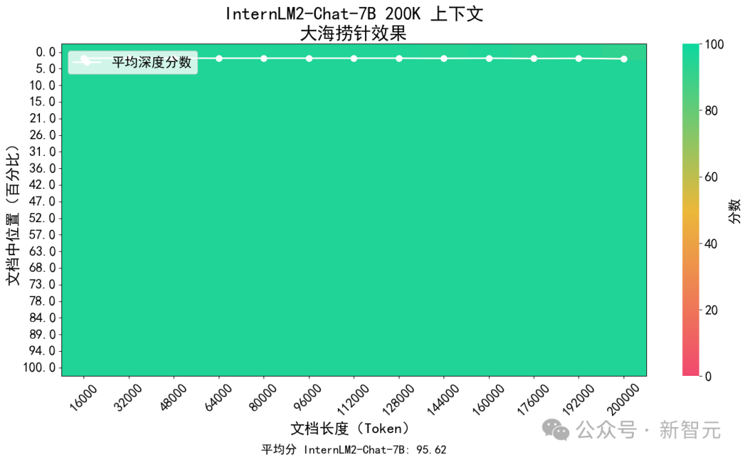 上图展示了InternLM2在不同长度的上下文(横轴)及上下文中不同位置(纵轴)上召回关键信息的准确率(Recall)。红色代表较低的召回准确率,而绿色则代表较高的召回率。