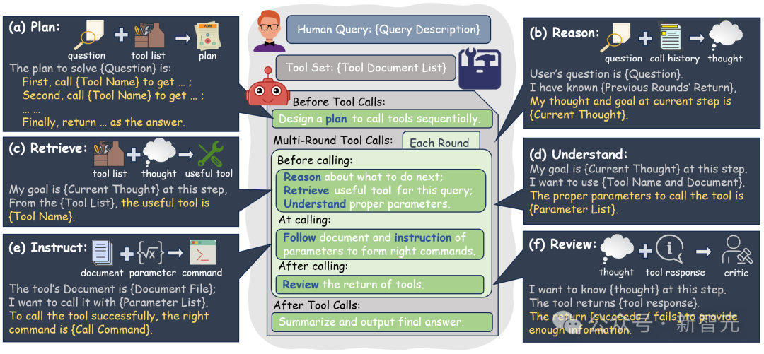 针对模型调用工具流程,研究人员还实施了细粒度的拆解和分析,针对规划、推理、工具选择、理解、执行、反思等步骤进行了针对性增强和优化。