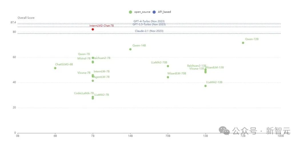 结果显示,InternLM2-Chat-7B在该评测集上的表现已经超越了Claude-2.1和目前的开源模型,性能接近GPT-3.5。