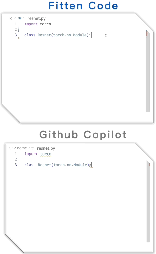 同样是面对“编写ResNet模型”这个任务,速度上的差距可谓是肉眼可见——Fitten Code平均延迟只有300ms,而GitHub Copilot首次延迟长达足足5秒。