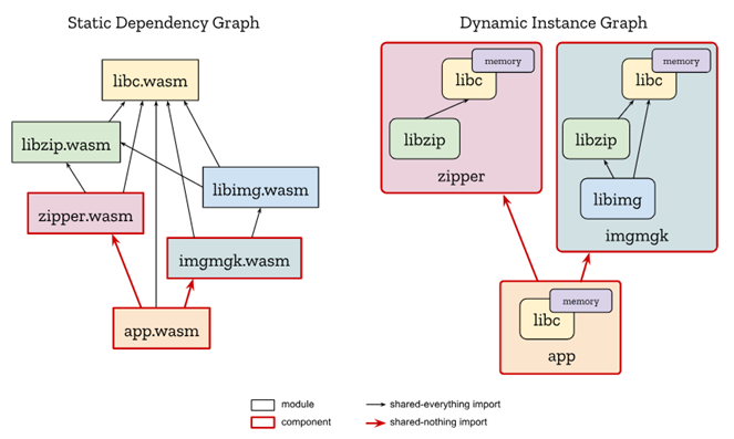 而如何在主模块的线性内存以及 wasm table 中预留出部分空间给副模块,以及对副模块的链接时机,是在主模块加载时链接(Load-time dynamic linking),还是在主模块执行时加载(Runtime dynamic linking),可能是 wasm runtime 实现时需要考虑的问题。从目前来看,除了浏览器之外,似乎还没有 standalone runtime 实现了该技术。相对于组件模型,这种链接方式可以实现模块间零拷贝数据传递以提升性能,并且内存消耗较小,实现也相对比较容易,缺点是多语言支持较差,目前来看似乎只能支持 C/C++/Rust 等使用 clang 来编译的语言。