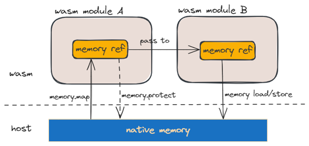 Memory Control 提议则希望可以减少 native 和 wasm 模块以及 wasm 模块之间的内存拷贝,并提供基于 host mmap 的内存映射和访问控制方式,比如在对内存初始化后将它设置成只读模式。它提出了 memory.map 和 memory.protect 等 opcode,可选方案之一是将 host 内存映射成一个 wasm 的内存引用,然后允许将该引用的句柄在共享的 heap 中传递到另一个 wasm 模块,这样目标模块可以通过该引用句柄来访问对应的内存,从而实现零拷贝数据传递。虽然该提议在 2022 年初就停止了更新,但是目前引起了较多兴趣,有不少讨论希望能继续推进该提议。