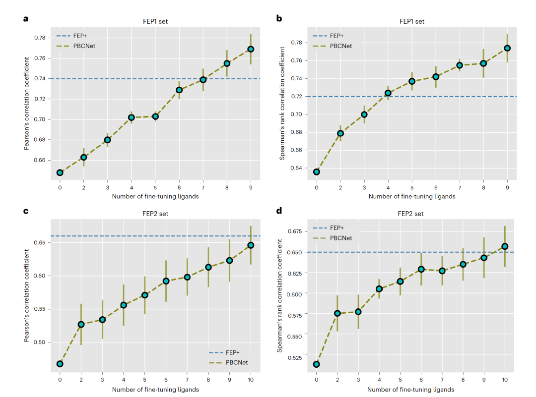 随后作者讨论了PBCNet在Few-shot learning情境下的表现及其与FEP+的比较。首先,作者指出PBCNet相对于FEP+在排名能力上的不足之处在于FEP+能够采样多种结合构象,而其他方法只使用单一快照,导致对分子结合过程的信息不够全面。然而,PBCNet在实际应用中对FEP+有两个优势:1. 高通量处理能力:PBCNet不受分子处理量的限制,允许全面探索先导优化。根据公开信息,运行FEP+每天处理四次变化需要八个Nvidia GTX-780 GPU,而PBCNet只需要使用一个Nvidia V100 GPU就能在0.9秒内计算一次变化。粗略估计,PBCNet的速度比FEP+快约10万倍。2. 灵活性:在先导优化过程中,新生成的结合亲和力数据可以用于微调PBCNet。为此使用了少样本学习。在每个测试的同类配体系列中,随机选择几个(大约2-10个)已知结合亲和力的配体作为微调配体,这些也在推断阶段作为参考配体。剩余的配体是待测试的配体。为避免随机性,重复上述过程十次。在新测试系列上,经过微调的模型表现在图3中进行了总结。图3显示少样本学习策略显著提升了PBCNet的性能,且随着微调配体数量的增加,性能提升。作者发现,微调后,PBCNet的排名能力与FEP+相当。例如,使用四个配体微调的PBCNet在FEP1集上的斯皮尔曼等级相关系数甚至超过了FEP+(0.724对0.720)。