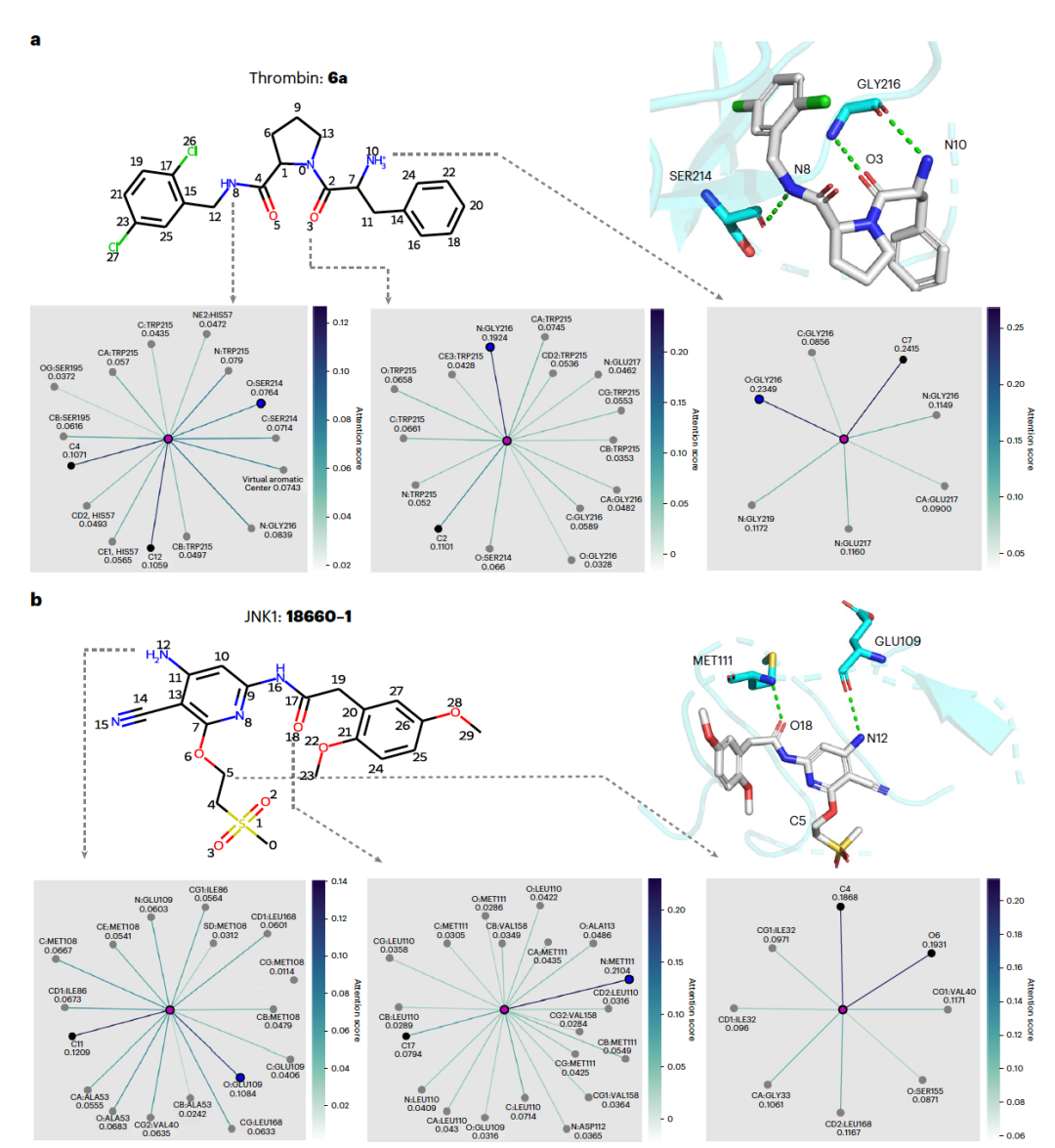 PBCNet引入了几种以物理为导向的建模策略。这是基于一个理念:分子间相互作用总是遵循严格的几何规则。通过解读研究,作者们发现赋予蛋白质-配体原子对较高的注意力得分可能表明更显著的相互作用。换句话说,如果PBCNet在分析蛋白质和药物分子结合时,给某些原子对分配了较高的分数,这可能意味着这些原子对之间的相互作用特别重要。此外,PBCNet还专注于那些能形成分子间相互作用的分子亚结构。这意味着它不仅分析整个分子,还关注分子中那些对结合特别重要的部分。通过这种方式,PBCNet能够更准确地预测不同药物分子与目标蛋白之间的结合亲和力。