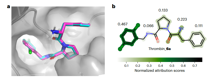药物化学家更倾向于从化学意义上的片段(亚结构)而非单个原子来探究分子的属性。因此,研究者扩展了他们的分析,以包括亚结构级别的可解释性。在这项分析中,作者采用了亚结构掩码解释(Substructure Mask Explanation, SME)方法(类似Shapley Value)。假设模型对一个化合物的预测值为y。然后,使用BRICS方法将化合物分割成亚结构。在读出阶段,依次掩盖每个亚结构的原子的表示,从而得到相应的预测值。当预测值代表化合物的活性时,如果某个亚结构掩盖后相比降低得更多,就认为相应的亚结构在模型预测中扮演着更关键的角色。作为案例研究,他们选取了凝血酶系统中的化合物6a,并使用化合物1a作为参考配体来说明PBCNet对化合物6a活性的预测(见图5a)。使用BRICS方法,将化合物6a分割成七个亚结构,酰胺组被分为两个不同的亚结构。为了给药物化学家提供更直观的表示,他们手动将酰胺组合并为一个整体。这一过程可视化展示在图5b中。结果显示,Sub4和Sub1对预测结果影响最大。PBCNet旨在预测配体对的相对结合亲和力,这主要来自一对配体的不同亚结构。Sub4作为化合物6a与化合物1a结构上的偏差部分被强调,这表明PBCNet确实捕捉到了输入配体之间的结构差异。此外,如图4a所示,Sub1与蛋白形成了两个氢键,因此Sub1的强调也意味着PBCNet专注于形成分子间相互作用的关键分子部分。