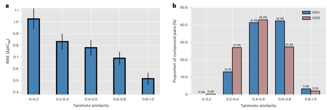 结果显示,PBCNet的性能明显优于除FEP+之外的所有基线方法(具体结果参考论文附录)。在FEP1测试集上,PBCNet的准确度达到了1.11 kcal/mol,接近于1 kcal/mol的理想标准,并且在FEP2测试集上实现了最低的平均成对均方根误差(r.m.s.e.pw)1.49 kcal/mol。此外,PBCNet的性能表现出稳健性,与其他高通量基线方法相比,在所有测试系列中表现更为稳定。这从斯皮尔曼等级相关系数可以看出;PBCNet在所有测试系列中的相关性都超过0.30,而其他高通量基线方法的相关性波动较大。PBCNet在FEP1测试集上的性能优于FEP2集,可能是由于FEP2集中有一些超出领域的样本。作为先导优化的模型,PBCNet旨在推断结构类似物的活性差异。为了与应用场景保持一致,训练集由Tanimoto相似度得分高于0.6的分子对组成。图2a显示了模型准确度与分子相似度之间的关系,可以观察到明显的负相关性。因此,PBCNet的相似度依赖性能是可以预料的,因为识别不同结构的分子更多地与虚拟筛选相关,而不是先导优化。相应地,为虚拟筛选设计的方法和模型在先导优化方面表现通常较差,例如在这里评估的Glide和PIGNet。作者还统计了FEP1和FEP2测试集中不同相似度得分的配体对的比例。图2b显示,在FEP2集中,Tanimoto相似度得分低于0.6的分子对比例显著高于FEP1集(70.4%对54.4%),这可能导致了模型在两个测试集上的性能差异。然而,PBCNet在FEP2测试集上的排名性能仍然超过了所有基线方法,除了FEP+。