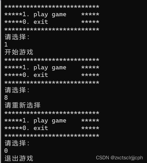 用一个整数接受输入的数值,当选择1的时候开始玩游戏,选择0的时候退出游戏,用case语句实现分支,不满足case语句时就使用default。