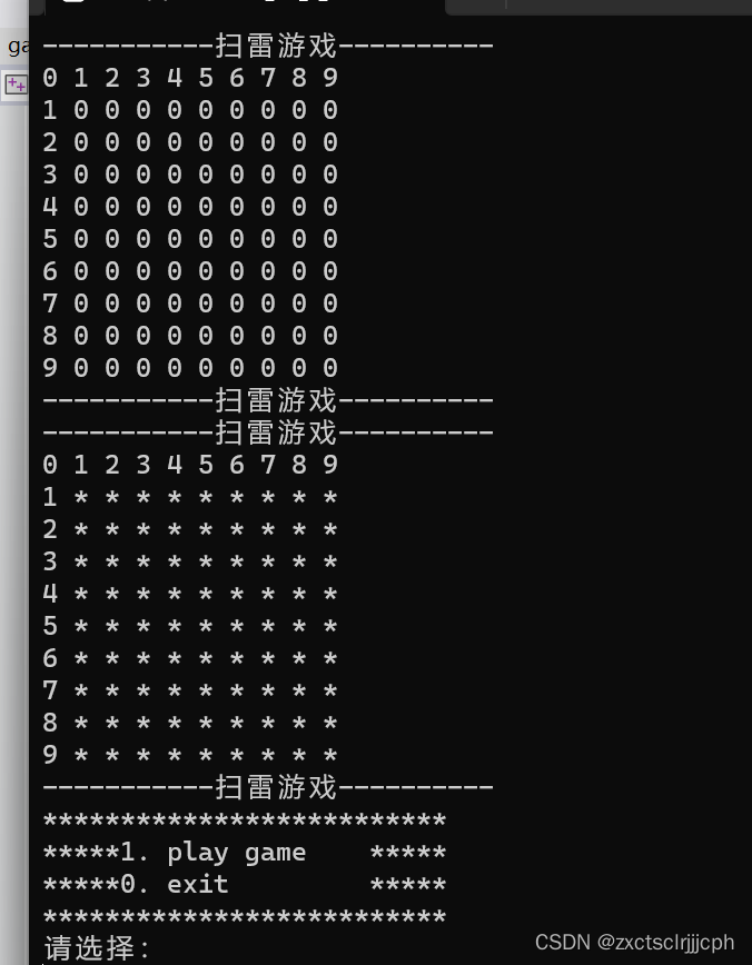 而对于show数组来说,最初一个雷都没有的时候,最好全部放*。 在没有排查到雷时放 ‘*’ 排查到雷时放数字字符。