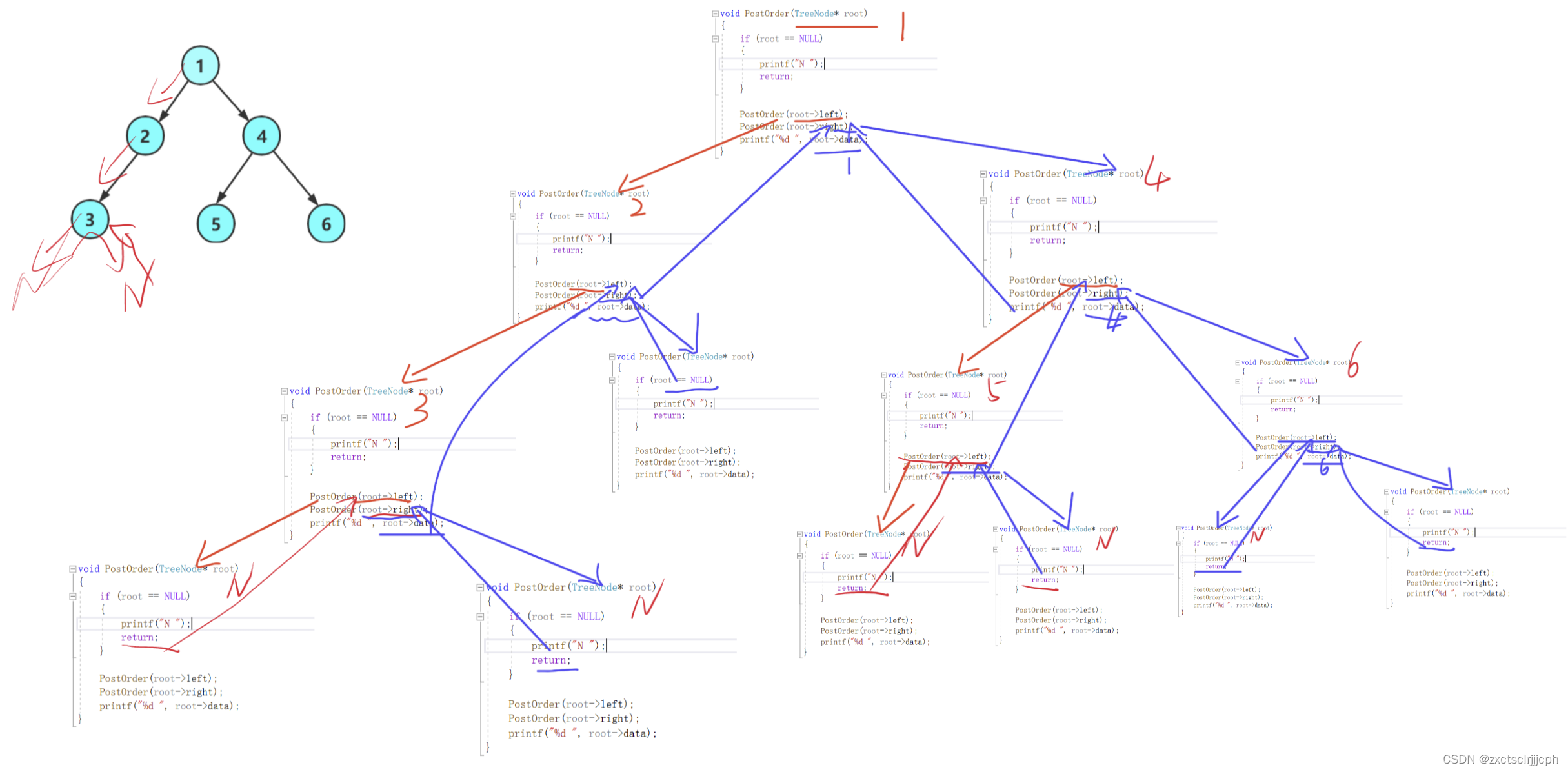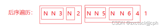 先访问它的左子树,然后右子树,最后才是根。 要当左右都为空时才访问第一个节点。