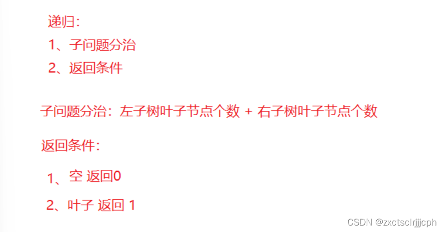 先得判断一下树是不是空树,不是才能就行进行。 不是空树,而且左右节点都为空,就是叶子节点,就返回1; 不是空,也不是叶子节点就采用分治,树的节点就等于左右叶子节点的和。